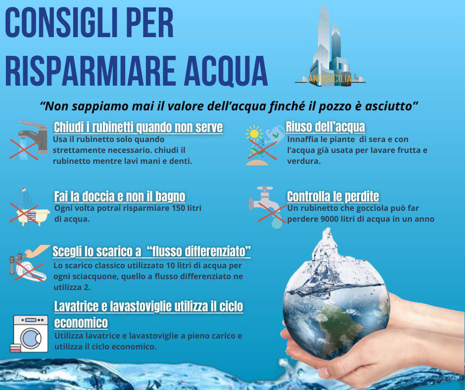 L'autorità Di Bacino Del distretto Idrografico Della Sicilia, Ordinanza Commissariale n.1 del 04.04.2024 del Commissario Delegato Ex D.G.R. N.100 Dell'11/03/2024, D.P. 518/Gab del 21/03/2024, ha adottato l'allegato Vademecum delle azioni e buone pratiche finalizzate al risparmio idrico potabile ed alla riduzione dei consumi contenente un elenco non esaustivo di misure utili alla sensibilazzazione verso il risparmio dell'acqua potabile ed un più razionale utilizzo della risorsa idrica, introducendo una serie di indicazioni utili per razionalizzare i consumi.