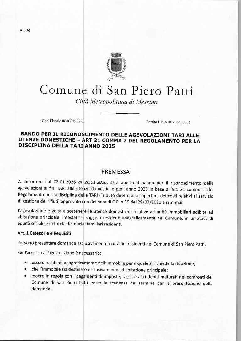 A decorrere dal 02.01.2026 al 26.01.2026, sarà aperto il bando per il riconoscimento delle agevolazioni ai fini TARI alle utenze domestiche per l’anno 2025.