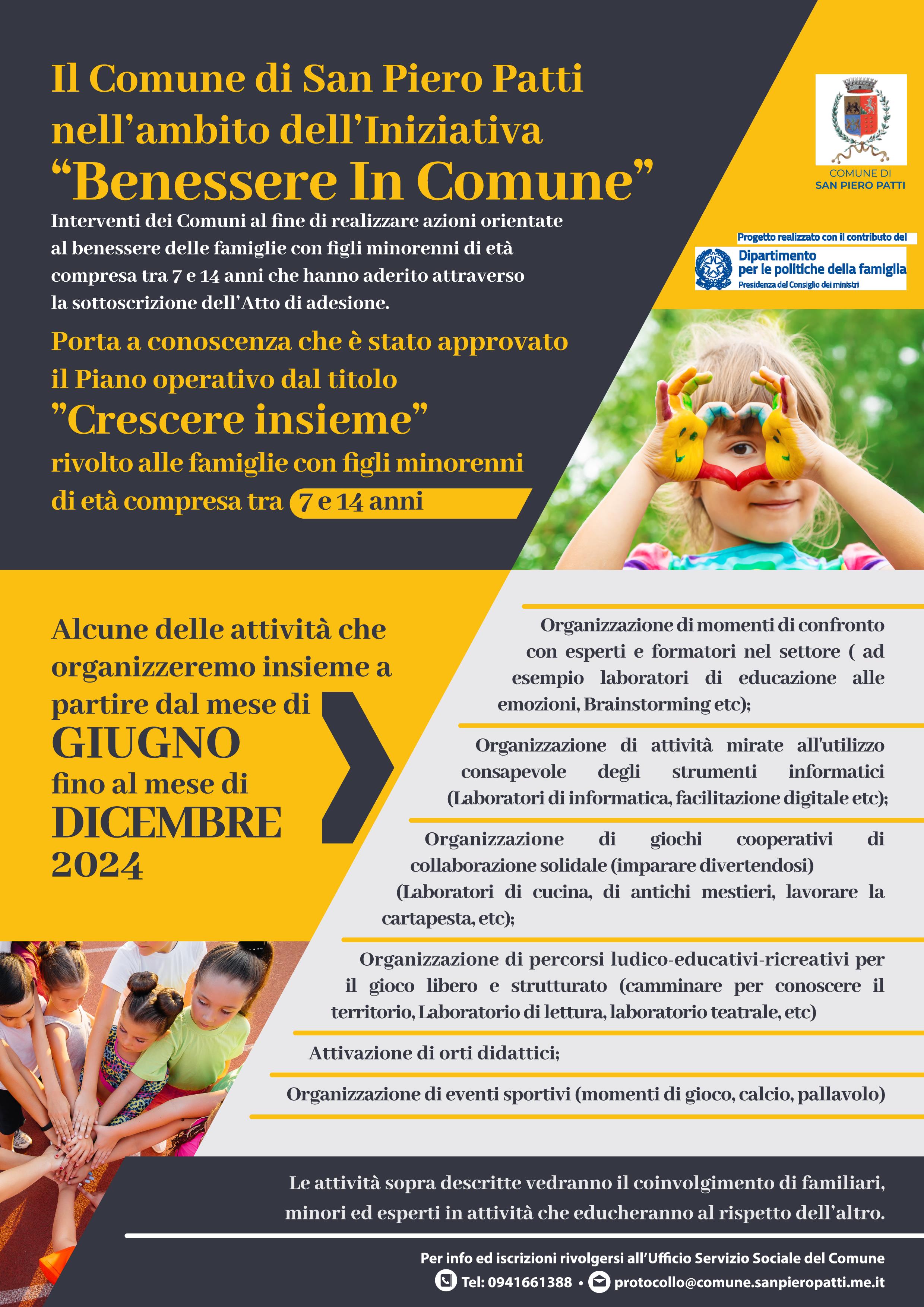 "Benessere In Comune" Interventi dei Comuni al fine di realizzare azioni orientate al benessere delle famiglie con figli minorenni di età compresa tra 7 e 14 anni che hanno aderito attraverso la sottoscrizione dell'Atto di adesione. Porta a conoscenza che è stato approvato il Piano operativo dal titolo "Crescere insieme" rivolto alle famiglie con figli minorenni di età compresa tra 7 e 14 anni